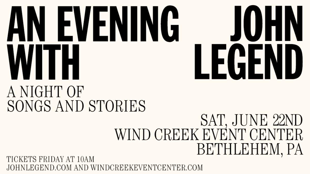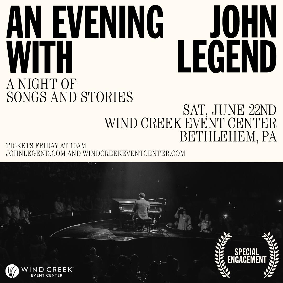 An Evening with John Legend - A Night of Songs and Stories June 22, 2024 Wind Creek Event Center - Bethlehem, PA On sale: Friday, Feb. 16th at 10AM at WindCreekEventCenter.com Pre-Sale: Thurs. Feb. 15th from 12N - 10PM - Use password: TIME