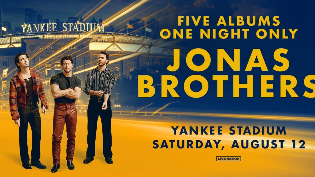 Just Announced: Jonas Brothers - ONE NIGHT ONLY Yankee Stadium - The Bronx - NY Saturday, Aug. 12th Tickets go on sale Friday, April 14th at 10AM - Ticketmaster.com
